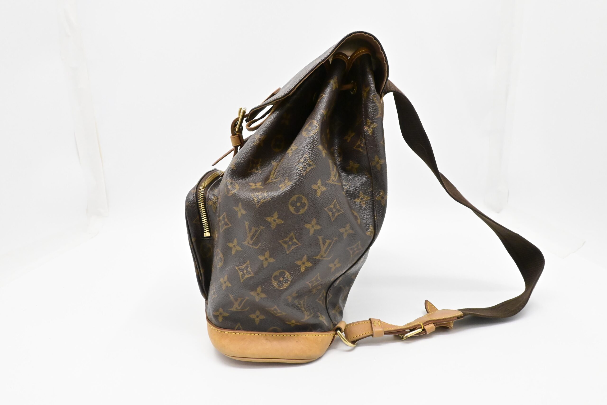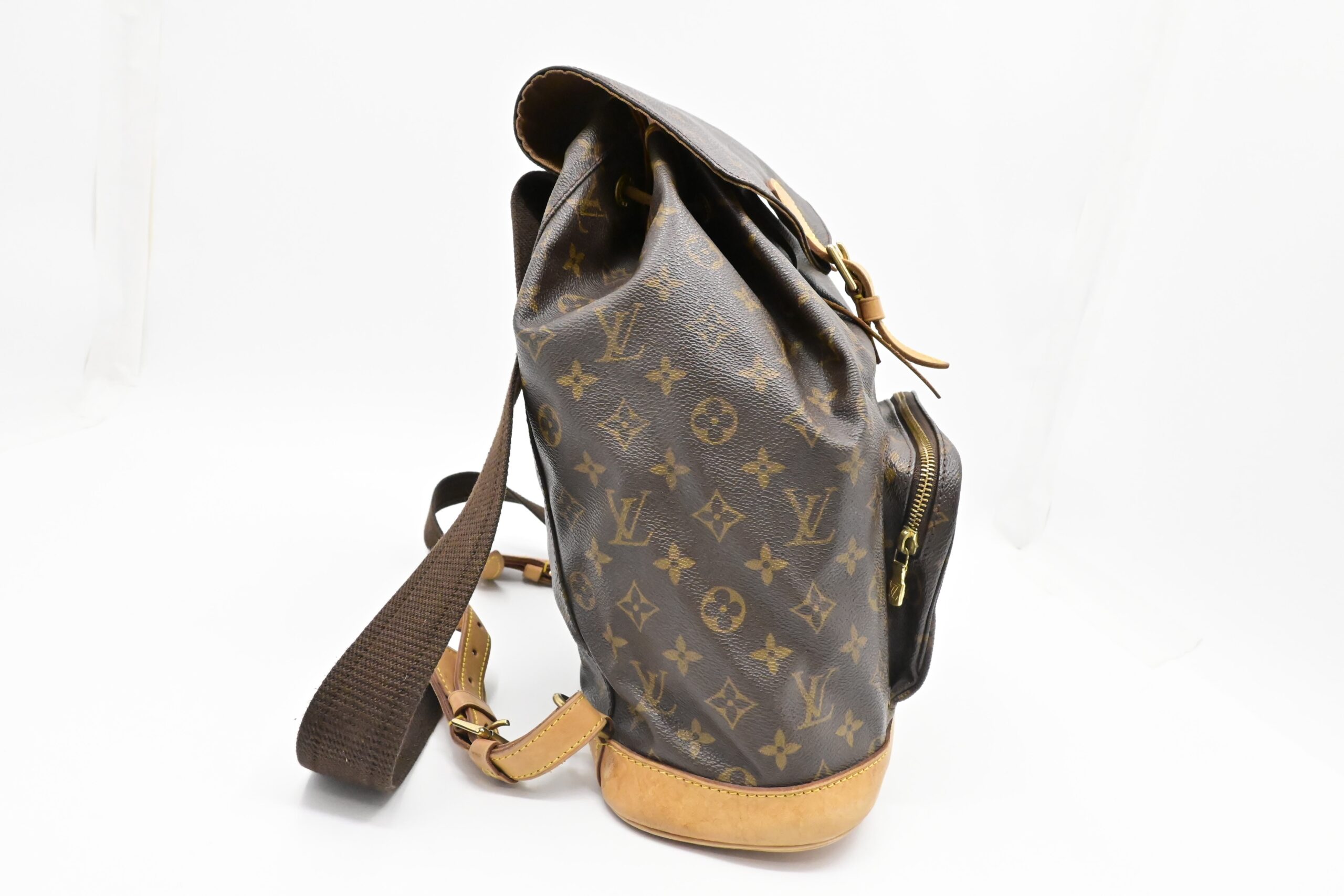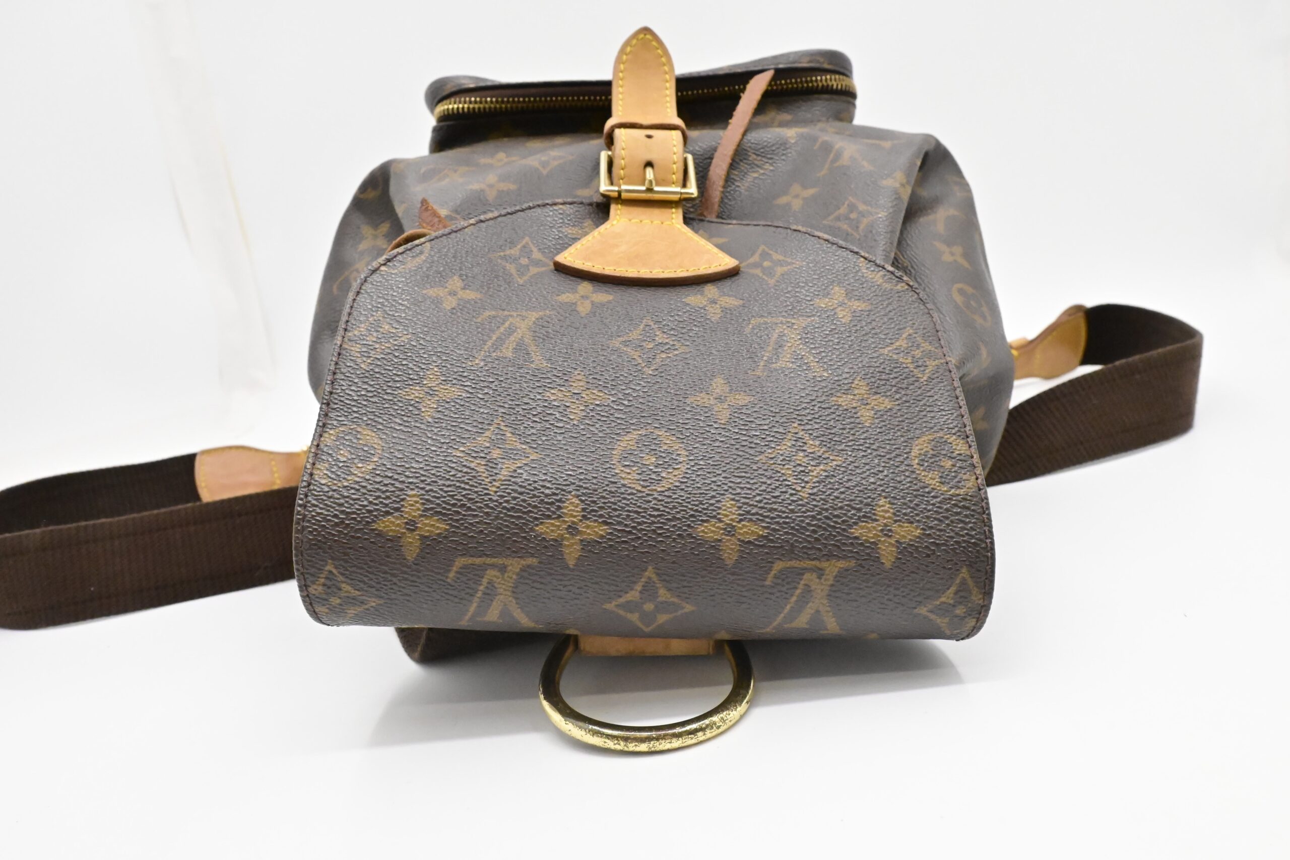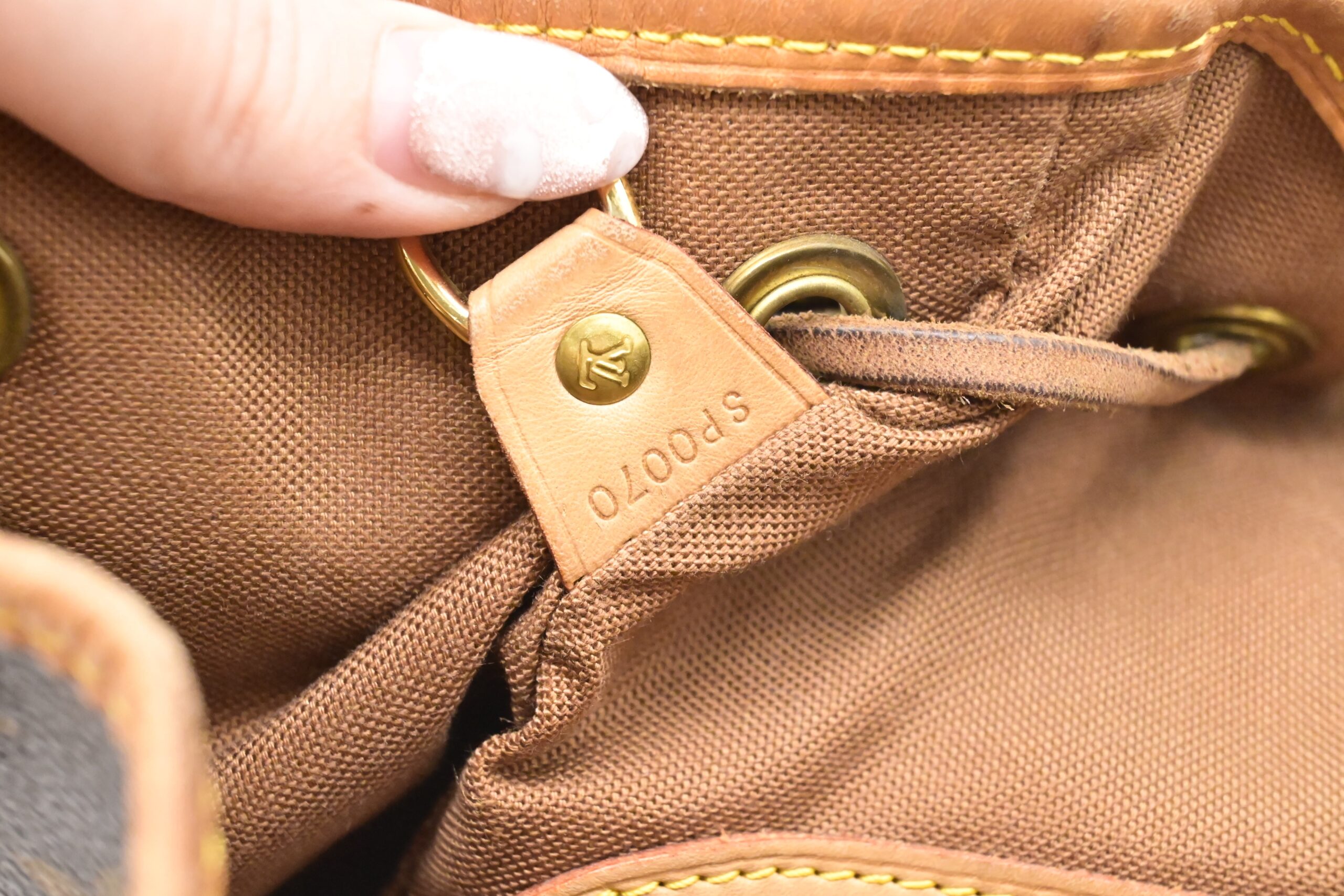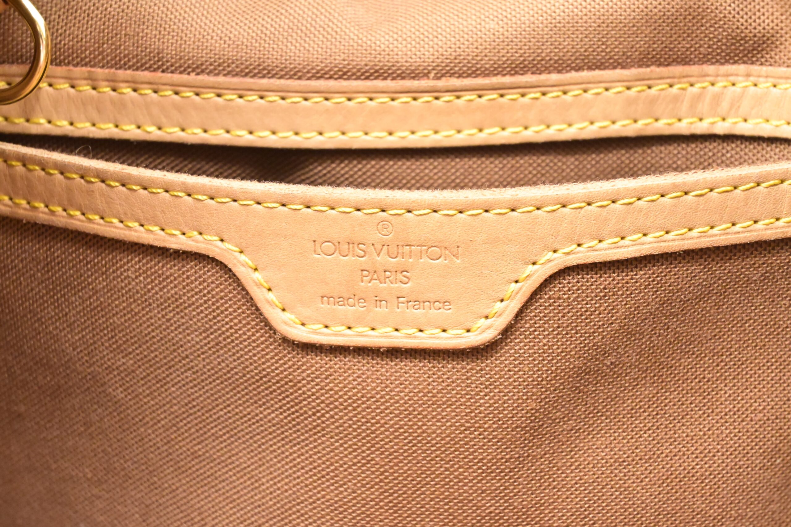 – Leather parts/Vachetta: Very good, some faint marks, light rub, slight water marks. Some wear on drawstring
