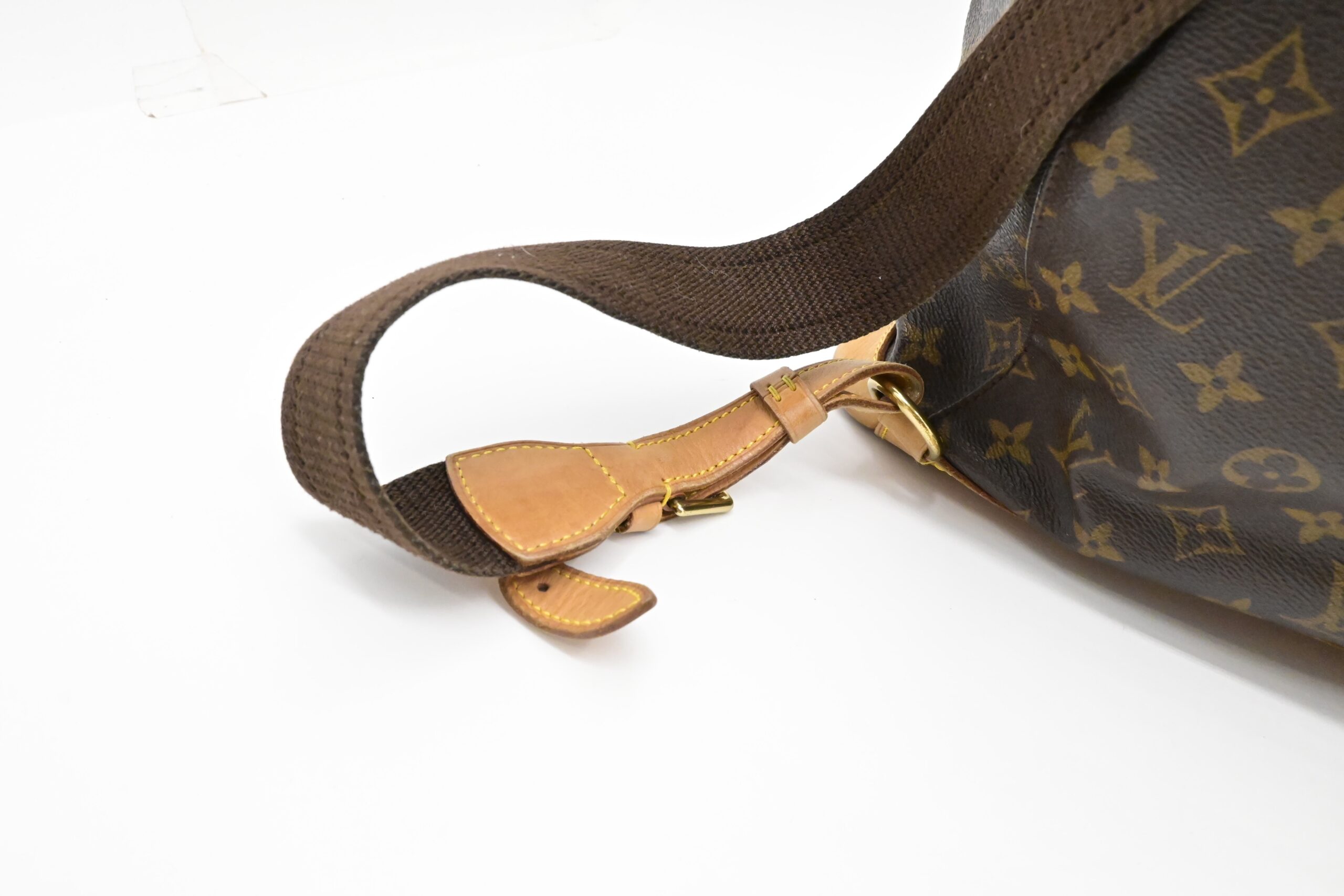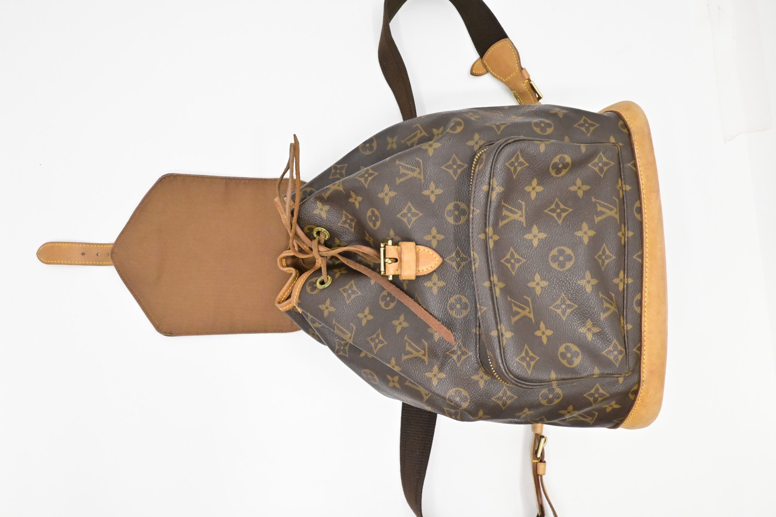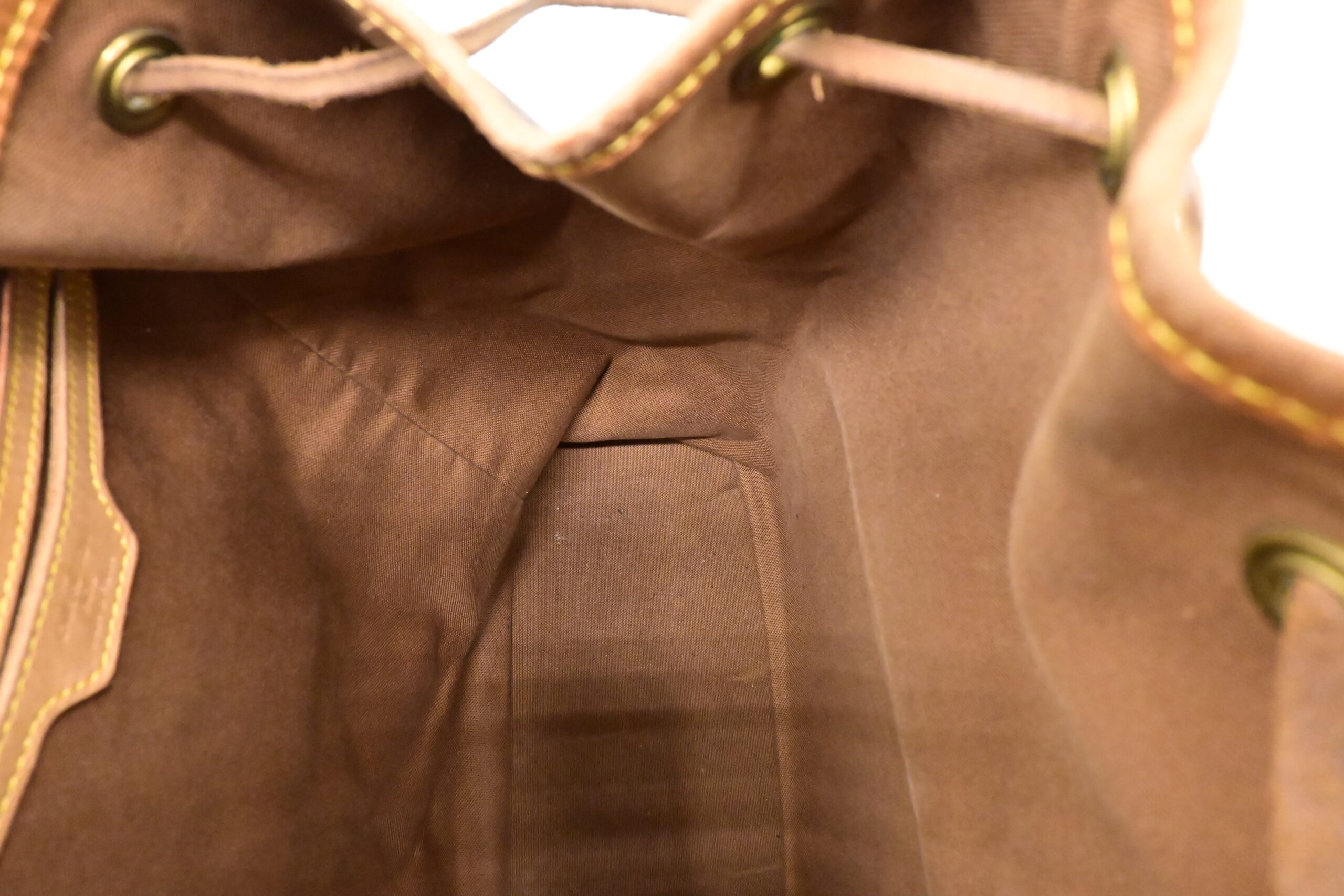– Leather parts/Vachetta: Very good, some faint marks, light rub, slight water marks. Some wear on drawstring