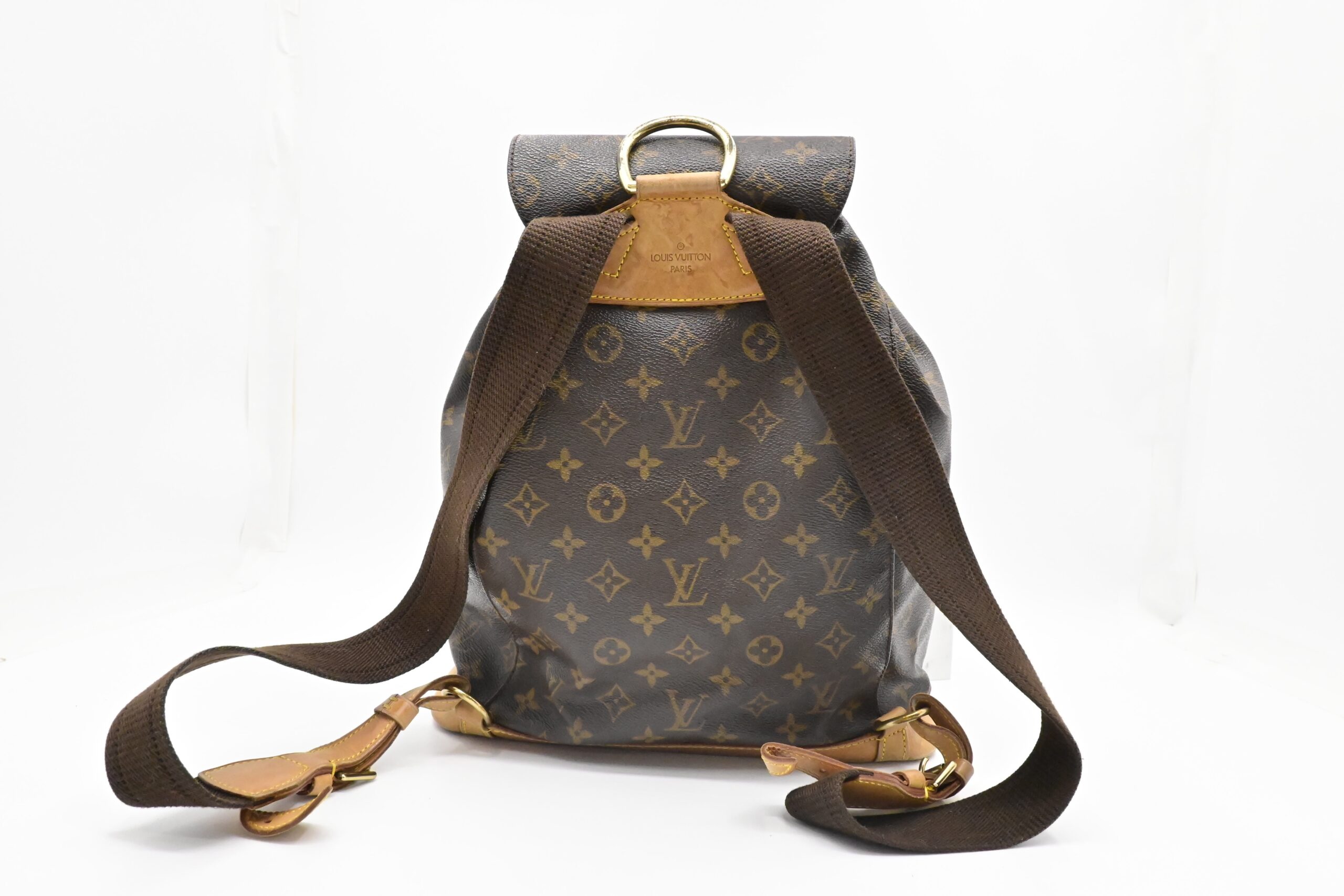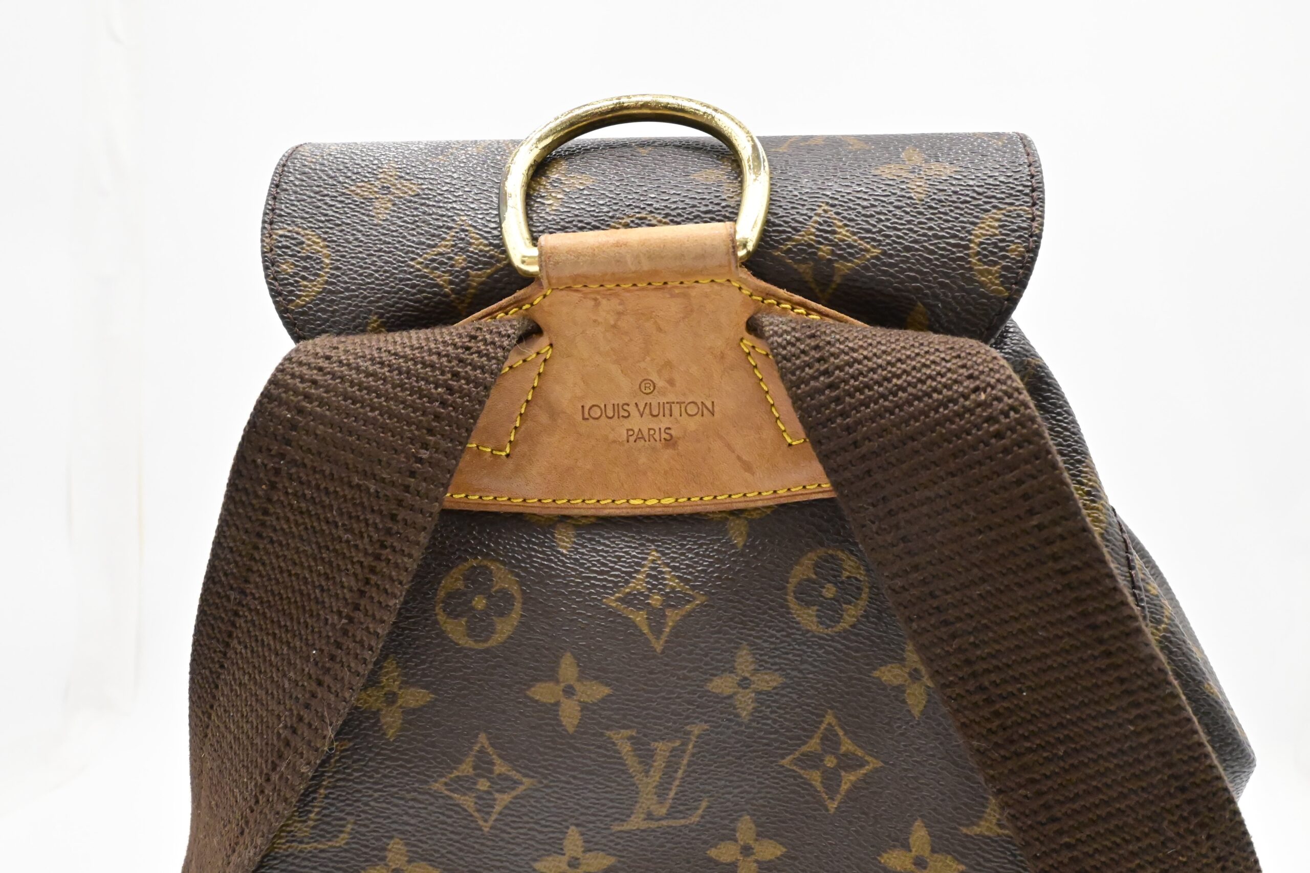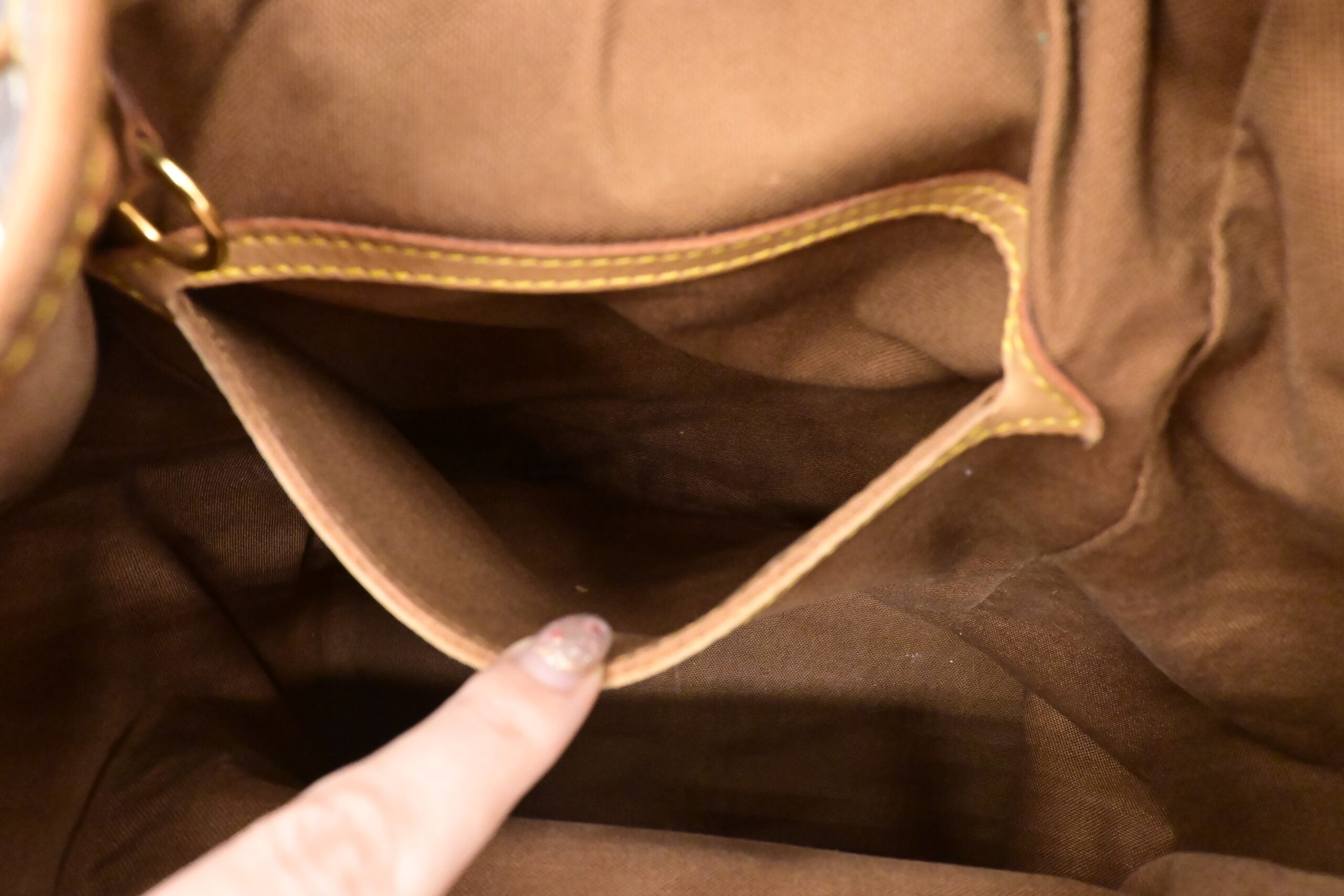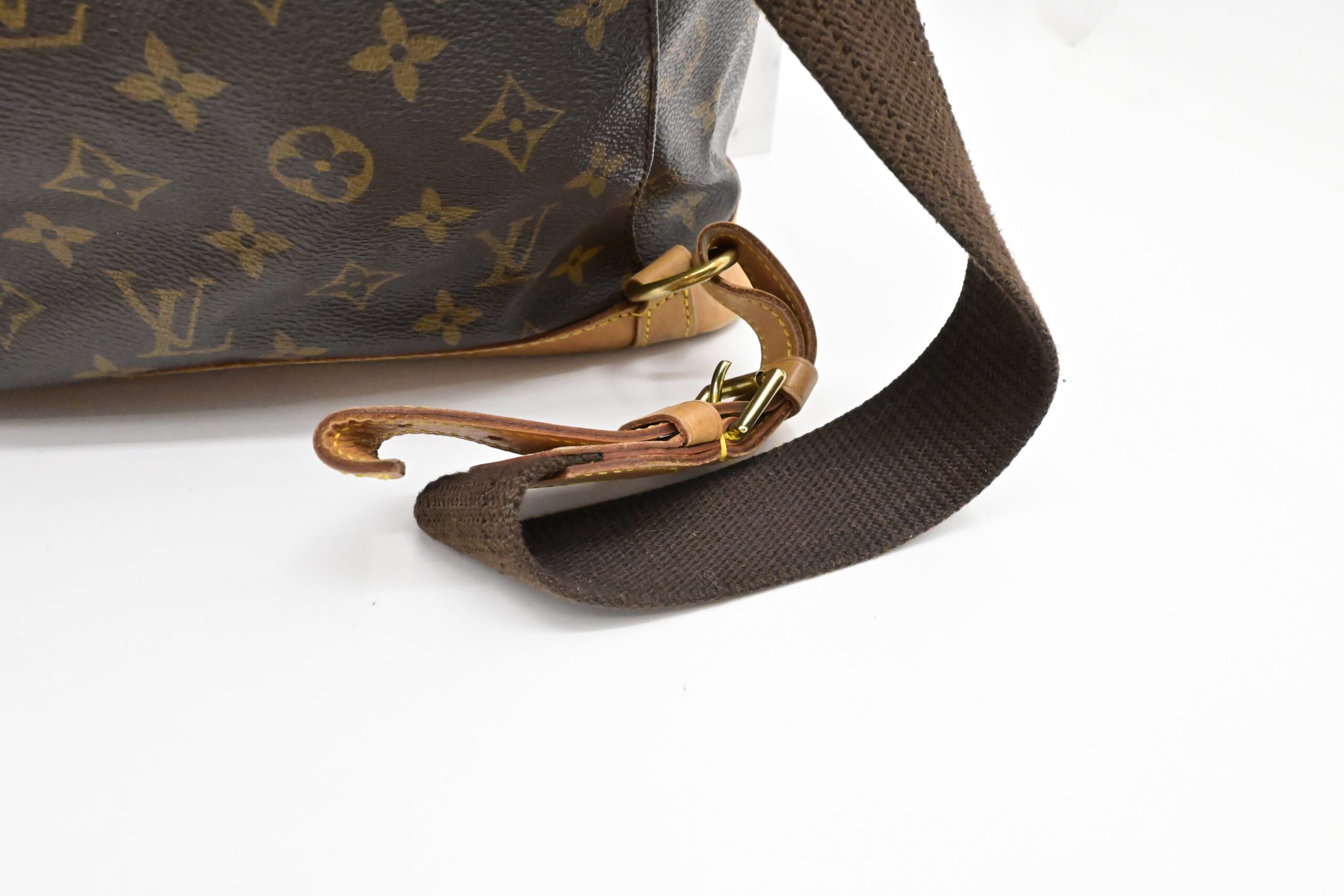 – Leather parts/Vachetta: Very good, some faint marks, light rub, slight water marks. Some wear on drawstring